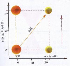 將一個事件的四座標作為在所謂的空間─時間的四維空間中指定其位置的手段經常是有助的。對我來說,摹想三維空間已經足夠困難!然而很容易畫出二維空間圖,例如地球的表面。(地球的表面是兩維的,因為它上面的點的位置可以用兩個座標,例如緯度和經度來確定。)通常我將使用二維圖,向上增加的方向是時間,水平方向是其中的一個空間座標。不管另外兩個空間座標,或者有時用透視法將其中一個表示出來。(這些被稱為空間─時間圖,如圖二.一所示。)例如,在圖二.二中時間是向上的,並以年作單位,而沿著從太陽到α-半人馬座連線的距離在水平方向上以英哩來測量。太陽和α-半人馬座通過空間─時間的途徑是由圖中的左邊和右邊的垂直線來表示。從太陽發出的光線沿著對角線走,並且要花四年的時間才能從太陽走到α-半人馬座。