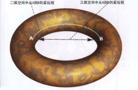 弦理論也導致無窮大,但是人們認為,它們在一種類似異形弦的變體中會被消除掉(雖然這一點還沒被確認)。然而,弦理論有更大的問題:似乎只有當空間─時間是十維或二十六維,而不是通常的四維時它們才是協調的!當然,額外的空間─時間維數是科學幻想的老生常談;的確,它們幾乎是必不可少的,因為否則相對論對人們不能旅行得比光更快的限制意味著,由於要花這麼長的時間,以至於在恆星和星系之間的旅行成為不可能。科學幻想的辦法是,人們可以通過更高的維數抄近路。這一點可用以下方法描述。想像我們生活的空間只有二維,並且彎曲成像一個錨圈或環的表面(圖十.七)。如果你是處在這圈的內側的一邊而要到另一邊去,你必須沿著圈的內邊緣走一圈。然而,你如果允許在第三維空間裡旅行,則可以直穿過去。