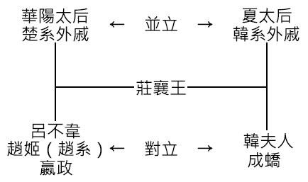 孝文王即位時已經五十多歲,身體衰弱,正式即位三天就死去,子異即位,是為莊襄王。莊襄王即位以後,養母華陽夫人被尊為華陽太后,生母夏姬被尊為夏太后,兩宮太后的局面正式形成。在咸陽的秦國宮廷中,以莊襄王嬴異為中心,以兩位太后為雙翼,形成一種微妙的政治關係網。為了明了起見,我將這種關係網列如下: