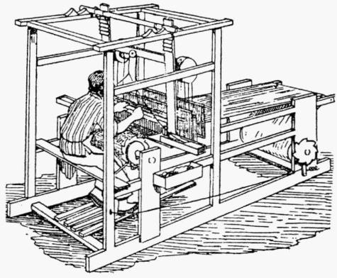 「在一臺織布機上,他們把紡好的線很整齊地一排排地列著,組成所謂經線。織布人的腳踏著一塊板往下一沉,這些線的一半便沉下去,另一半的線則升起來。同時織布人又把梭子上的線從線的兩半之間橫穿過去,從左到右,以後再從右到左。從這樣的交叉中,織成的布便成形了。完工後,草本植物製成的布便換了主人;大麻的皮變成了布,亞麻的皮變成了高貴的花邊,一匹布要値好幾十元呢。」
