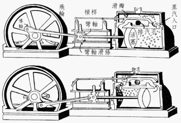 「蒸汽在推動活塞以後,便進入冒出黑煙的煙囪裡。因此你們可以看見那煙囪有時噴出白煙,有時則噴出黑煙。黑煙是從火爐通過在水中的管子裡冒出來的,白煙則是在蒸汽每一次推動活塞時,從圓筒中溜出來的。這些白煙在推動活塞後,猛烈地從圓筒衝到煙囪裡,使得機器在動作時發出聲音。」