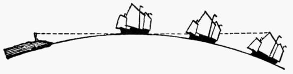 「在陸地上,要找一處地方,它的面積要整齊,要最適於觀察之用,如我剛才告訴你們的那樣,是很不容易的。總是有山丘、斜坡或者樹木橫隔著視線,阻止人們從頂到底看見隱約的塔和高樓,這塔或高樓正是他走去的方向。在海面上,沒有什麼障礙物會阻擋視線,除非那是水的凸面,這凸面是跟著地球的整個弧線而成的。因此,那裡是特別容易研究出地球圓形所產生的現象。