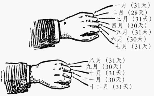 「我們的手上,有著一本天然的曆書,它能告訴我們一個很簡單的方法。你們把左手握起拳來,除去大拇指外,四個指骨各自凸成一個骨峰,與中間凹下的骨巢分開些。你們把右手食指放在這些骨峰與骨巢上,依次從小指骨峰上開始數,同時照著一年內各月份的次序數下去,一月、二月、三月……當四個指節都數完後,便可回到起頭處,繼續把未完的月份數下去。這樣,凡是在骨峰上的月份都是三十一天;而在骨巢裡的月份則是三十天。你們必須把第一個骨巢內的二月份除去。那是照著年份大小而爲二十八天或二十九天的。」