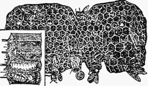 「蜜房是水平地排列著的,背對著背,尾接著尾,末端都是相連著的。還有,它們邊也接著邊、或多或少地緊排著,它們互相以其平面接觸著,每一塊平面都作爲兩個相鄰著的蜜房共有壁。這兩層在背後相接著的蜜房,組成了一個所謂的蜂房或蜂窩。在這一面的蜂房,有著到這面蜜房裡去的一切入口;在另一面,也同樣有著那面的蜜房入口處。最後,蜂窩會在巢箱裡垂直倒掛著,它的口一半向右一半向左。緊貼在巢箱的上部或箱頂上,或緊貼在裡面交叉著的棒子上。