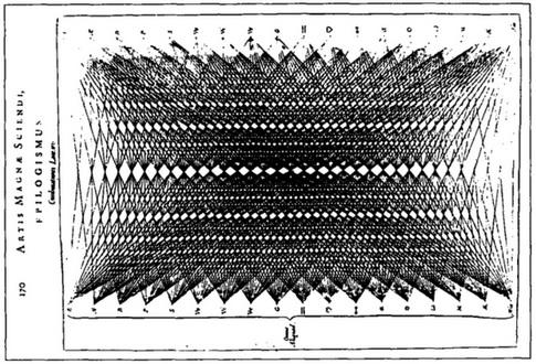 狄歐塔列弗說:「普洛文斯的可憐老聖堂武士和培根派系都還不明瞭,但耶穌會卻知道重建地圖可以以組合的藝術來完成;換句話說,以一種預示今日電腦的方法。耶穌會是首先發明阿布拉非亞的人!柯契爾神父重讀所有關於組合藝術的論述,結果便是他收錄在其著作《學術大藝術》之中的這幅圖……」