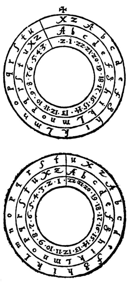 「也許他在第二、第三、和第四位置也需要特定的字母,也許我們這個聰明的殷戈要一個綜合十彩的信息;也許他想要比特利牟斯聰明。特利牟斯建議了四十種主要密碼解法:其中之一,只看每個字的第一個字母;另一種,看第一和第三個字母;又一種,每隔一個字的第一個字母,等等,直到你只要用點腦筋,便可發明一百種你自己的方法。至於十種次要解讀法,上校只考慮第一圈,也就是最容易的。可是接下來的卻都以第二圈的原則為準。我影印了解讀圈圖(附圖五)給你看。想像最内圈是可以轉動的,你將它轉到字母『A』與外圍的任何一個字母平齊,你便會得到一個體系,其中將『A』替換為『X』,另一體系則以『U』代替『A』,依此類推……每一圈二十二個字母,你便可以得到二十一種解讀系統。第二十二個沒有用,因為『A』便是『A』……」