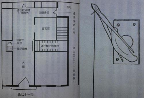 「非常好,凡斯先生——非常好!」他邊說邊點頭,「讓人一目了然,嗯,不需要解釋。——在你按了公寓門鈴後,先順著後廳通道跑到側門將門打開,然後再跑回來敲門。之後你從前門離去,轉向百老匯大道,再繞一圈掉轉頭走進大樓旁的窄巷,接著從側門進來,然後背著我們靜悄悄地潛入公寓。」