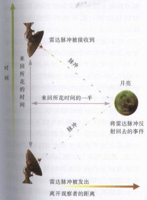 相對論的一個同等卓越的成果是,它變革了我們對空間和時間的觀念。在牛頓理論中,如果有一光脈沖從一處發到另一處,(由於時間是絕對的)不同的觀測者對這個過程所花的時間不會有異議,但是他們不會在光走過的距離這一點上取得一致的意見(因為空間不是絕對的)。由於光速等於這距離除以所花的時間,不同的觀察者就測量到不同的光速。另一方面,在相對論中,所有的觀察者必須在光是以多快的速度運動上取得一致意見。然而,他們在光走過多遠的距離上不能取得一致意見。所以現在他們對光要花多少時間上也不會取得一致意見。(無論如何,光所花的時間正是用光速——這一點所有的觀察者都是一致的——去除光所走的距離——這一點對他們來說是不一致的。)總之,相對論終結了絕對時間的觀念!這樣,每個觀察者都有以自己所攜帶的鐘測量的時間,而不同觀察者攜帶的同樣的鐘的讀數不必要一致。