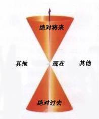 一個事件P的過去和將來光錐將空間─時間分成三個區域(圖二.五):這事件的絕對將來是P的將來光錐的內部區域,這是所有可能被發生在P的事件影響的事件的集合。從P和*圖*書出發的信號不能傳到P光錐之外的事件去,因為沒有東西比光走得更快,所以它們不會被P發生的事情所影響。過去光錐內部區域的點是P的絕對過去,它是所有這樣的事件的集合,從該事件發出的以等於或低於光速的速度傳播的信號可到達P。所以,這是可能影響事件P的所有事件的集合。如果人們知道過去某一特定時刻在事件P的過去光錐內發生的一切,即能預言在P將會發生什麼。空間─時間的其餘部分即是除P的將來和過去光錐之外的所有事件的集合。這一部分的事件既不受P的影響,也不能影響P。例如,假定太陽就在此刻停止發光,它不會對此刻的地球發生影響,因為地球的此刻是在太陽熄滅這一事件的光錐之外(圖二.六)。我們只能在八分鐘之後才知道這一事件,這是光從太陽到達我們所花的時間。只有到那時候,地球上的事件才在太陽熄滅這一事件的將來光錐之內。同理,我們也不知道這一時刻發生在宇宙中更遠地方的事:我們看到的從很遠星系來的光是在幾百萬年之前發出的,在我們看到的最遠的物體的情況下,光是在八十億年前發出的。這樣當我們看宇宙時,我們是在看它的過去。