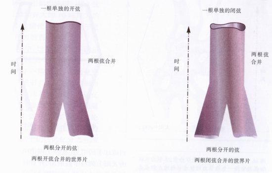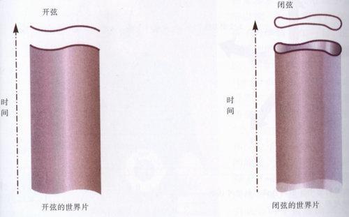 儘管存在這些問題,儘管超引力理論中的粒子似乎不與觀察到的粒子相符合的這一事實,大部分科學家仍然相信,超引力可能是對於物理學統一問題的正確答案。看來它是將引力和其他力相統一起來的最好辦法。然而一九八四年,人們的看法顯著地改變為更喜歡所謂的弦理論。在這些理論中,基本的對象不再是只佔空間單獨的點的粒子,而是只有長度而沒有其他線度、像是一根無限細的弦這樣的東西。這些弦可以有端點(所謂的開弦),或它們可以自身首尾相接成閉合的圈子(閉弦)(圖十.一和圖十.二)。在每一時刻每一個粒子佔據空間的一點。這樣,它的歷史可以在空間一時間用一根線代表(「世界線」)。另一方面,在每一時刻一根弦佔據空間的一根線。所以它在空間─時間裡的歷史是一個叫做世界片的二維面(在這世界片上的任一點都可用兩個數來描述:一個指明時間,另一個指明這一點在弦上的位置。)一根開弦的世界片是一帶子,它的邊緣代表弦的端點通過空間─時間的路徑(圖十.一);一根閉弦的世界片是一個圓柱或一個管(圖十.二);一個管的截面是一個圈,它代表在一特定時刻的弦的位置。