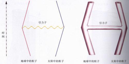 兩根弦可以連接在一起,形成一根單獨的弦。在開弦的情形下只要將它們端點連在一起即可(圖十.三);在閉弦的情形下,像是兩條褲腿合併成一條褲子(圖十.四)。類似地,一根單獨的弦可以分成兩根弦。在弦理論中,原先以為是粒子的東西,現在被描繪成在弦裡傳播的波動,如同振動著的風箏的弦上的波動。一個粒子從另一個粒子發射出來或者被吸收,對應於弦的分解和合併。例如,太陽作用到地球上的引力,在粒子理論中被描述成由太陽上的粒子發射出並被地球上的粒子所吸收的引力子(圖十.五)。在弦理論中,這個過程相應於一個H形狀的管(圖十.六)(弦理論有點像管道工程)。H的兩個垂直的邊對應於太陽和地球上的粒子,而水平的橫槓對應於在它們之間傳遞的引力子。