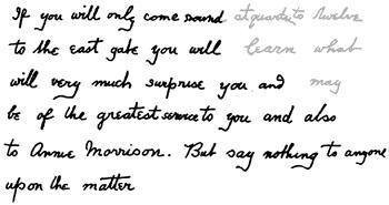 (密約信譯為——如果你在十一點三刻到東門口,你將得知一件極為意外、對你和安妮.莫里森都有極大好處的事。但不要將這件事告訴任何人。)