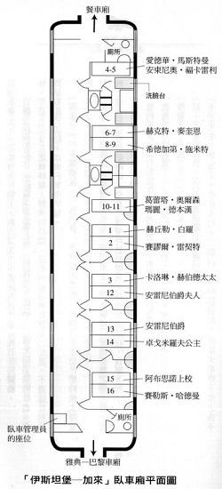 白羅和布克先生在一張桌子的同一邊坐下。醫生坐在走道上,白羅面前的桌上擺著一份伊斯坦堡—加來車廂的平面圖,上面用紅墨水註明各個包廂的乘客姓名。乘客的護照和車票堆放在桌子的另一邊。桌上還備有白紙、墨水、鋼筆和鉛筆。