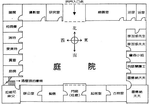 所有的房間,門都對著庭院開,窗戶大多也是如此——例外的是原來南邊所建的房間。那一邊的房子也有向外面鄉野開的窗房。不過,這些窗戶都由外面裝上鐵條。在西南角上有一個樓梯,通到一個有長欄干的屋頂,同南邊的建築一樣長,而且比其他三面的建築都高。柯爾曼先生領我走過庭院東邊,然後繞到一個佔據南邊中心的沒門的柱廊。他推開柱廊一邊的門,於是我們就走進一個房間。那裡有幾個人,圍著一個茶桌坐著。