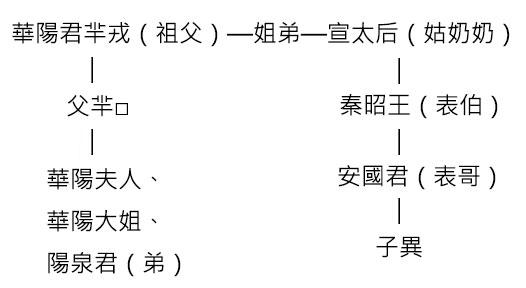 華陽夫人是宣太后的表姪孫女,秦昭王的表姪女,安國君的表妹,她與安國君的婚姻是親上加親的政治婚姻,而安排這樁婚事的人,當是宣太后和華陽君。正是由於這樁親上加親的政治婚姻的緣故,華陽夫人在安國君的繼承人問題上有決定性的發言權。為什麼這樣說呢?