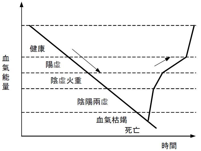 在血氣下降過程中,從健康進入陽虛,這時身體的能量不足以將疾病快速擊敗,因此經常生病。這樣的情形痊愈有兩種可能,一種是努力改善生活規律,增加身體的能量,使自己回到健康水平,讓身體有能力隨時快速的擊敗疾病,這是真正的痊癒。