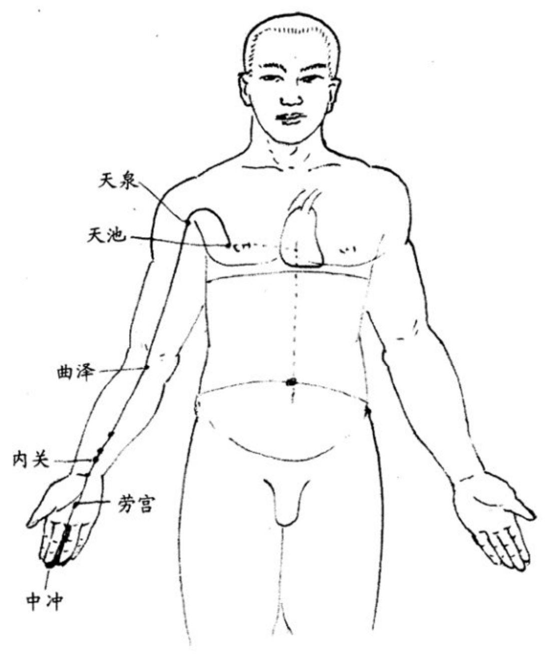 曲澤 | 仰掌,肘部微屈,在肘橫紋上,肱二頭肌腱的尺側緣取穴 | 清心鎮痛,和胃降逆 | 心痛、善驚、心悸、胃痛、嘔吐、咳血、轉筋、熱病、煩躁、肘臂痛 | 合穴 |