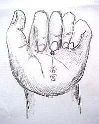勞宮 | 屈指握拳時,中指指尖所點處是穴 | 清心安神,消腫止癢 | 心痛,癲狂,癇證,嘔噦,胸脅痛,吐血衄血,大便血,咳喘,口瘡,舌爛,口臭,鵝掌風。 | 滎穴 |