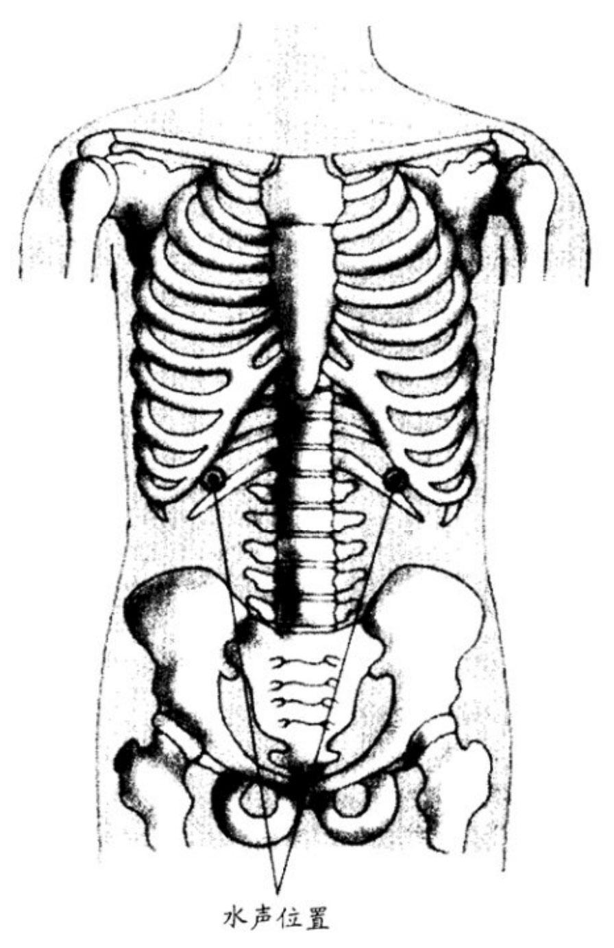 按摩這個經絡的穴位時,在人體胸前肋骨的下方「如圖」,可以聽到流水聲的變化。在按摩前先聽其聲音,按摩穴位時再聽,就能比較其差異,其聲音的差異就像在擠出容器中的液體一樣,壓了穴位一會兒就能聽到一些東西流了出去。由於按摩的穴位和聲音的出處有一段距離,因此從手壓下去,直到聽到聲音的變化,有一段時間差,按摩每個需要按摩的穴位都會產生聲音,如果長時間按摩一個穴位,既沒有痛感也沒有回饋的聲音,就表示這個穴位沒有問題,不需要按摩。