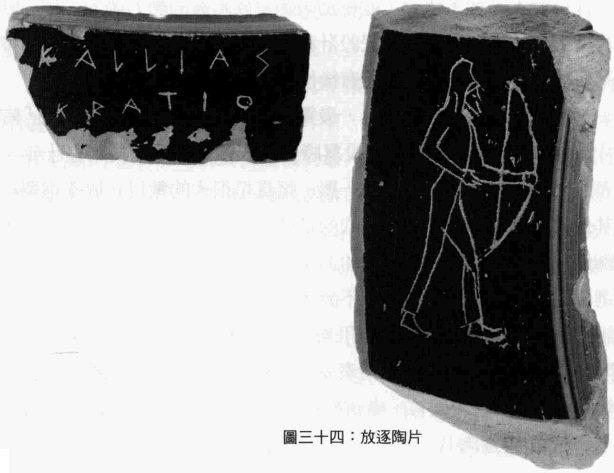 在限制個人權力一事上,最獨特和創新的民主制度措施是「陶片放逐制度」。全民議會可投票將某個人強制驅離阿提卡區十年。有六千名公民可投下這樣的一票,這真是很大的數目。放逐選擇和其他大部分的選舉不同,採取的是匿名投票,每個公民必須在一塊陶片寫下他希望被放逐的人的名字。義人亞里斯泰狄有個關於放逐選舉的故事非常有名。有個不識字的農夫見到他,並不認得他,但請他幫忙在陶片上寫下「亞里斯泰狄」。他幫農夫寫下名字,然後問農夫為何想要放逐亞里斯泰狄。「因為我聽人們叫他『義人』聽煩了。」農夫這麼回答。考古學家曾在一座古井的井底發現一百九十一片的放逐陶片,以十四種筆跡寫著「席米斯托克利」的名字——顯示有組織性偽造選票的情形。放逐選舉到西元前四八七或四八六年才真正開始施行(因此有些歷史學者懷疑克萊斯提尼斯改革期間真的有放逐選舉),在西元前四一七年之後便未再舉行,但在波希戰爭的動盪不安時期卻頻繁舉行。圖三十四的放逐陶片一面清楚刻著「卡里亞斯,奎提歐斯之子」的字樣,反面則畫著波斯弓箭手的諷刺畫。卡里亞斯似乎被視為人民的敵人和波斯的盟友。人民不但恐懼個人的權力過大,也擔心有人要讓雅典人淪為外國君主的奴隸。