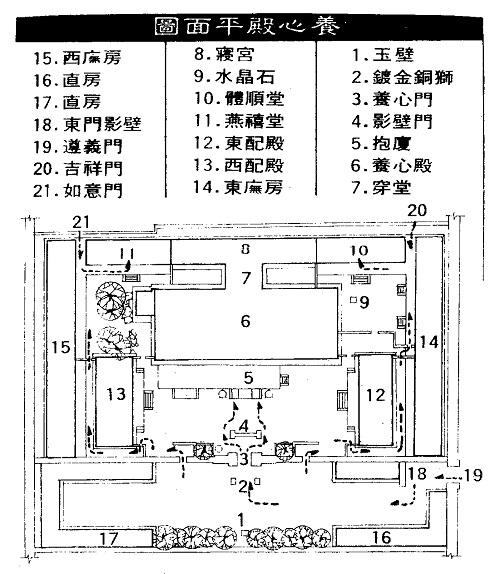 入養心殿從圖示19的遵義門開始,入門即為一座黃底,中心有鴛鴦戲水圖案的琉璃影壁(18),繞過影壁是一個狹長的院落,南牆一排森森松柏,其中有一項特殊的陳設,便是嵌在屏座上的一塊大玉壁,從壁孔中向北望,恰好看到「養心門」的匾額。
